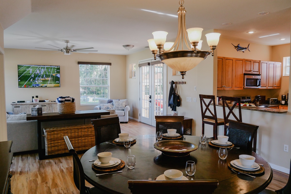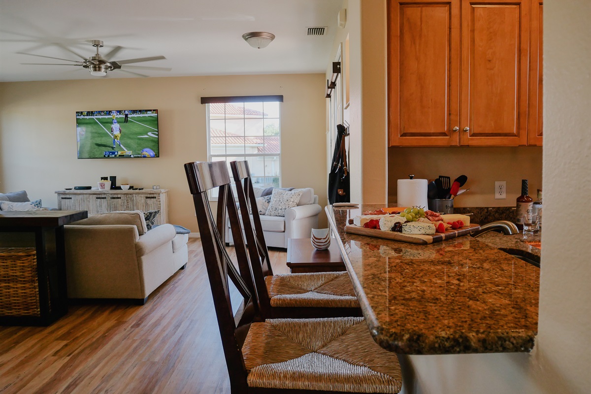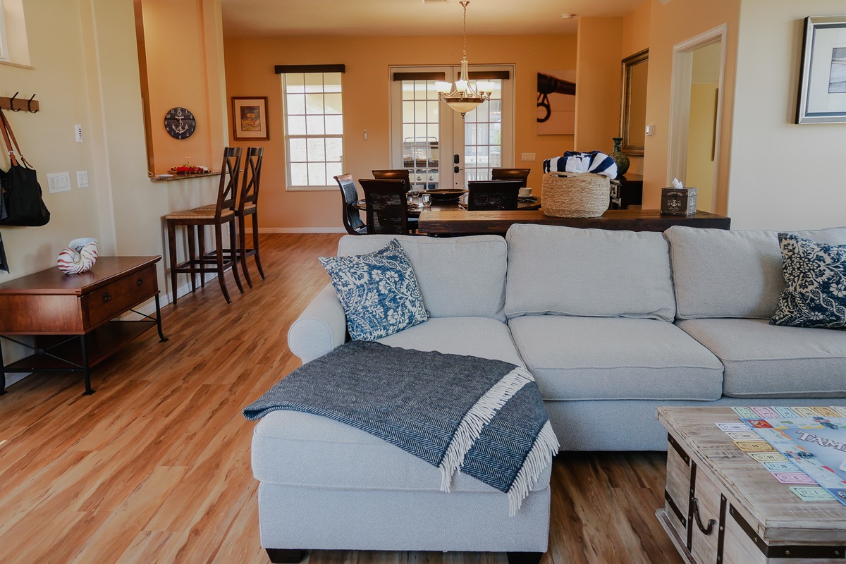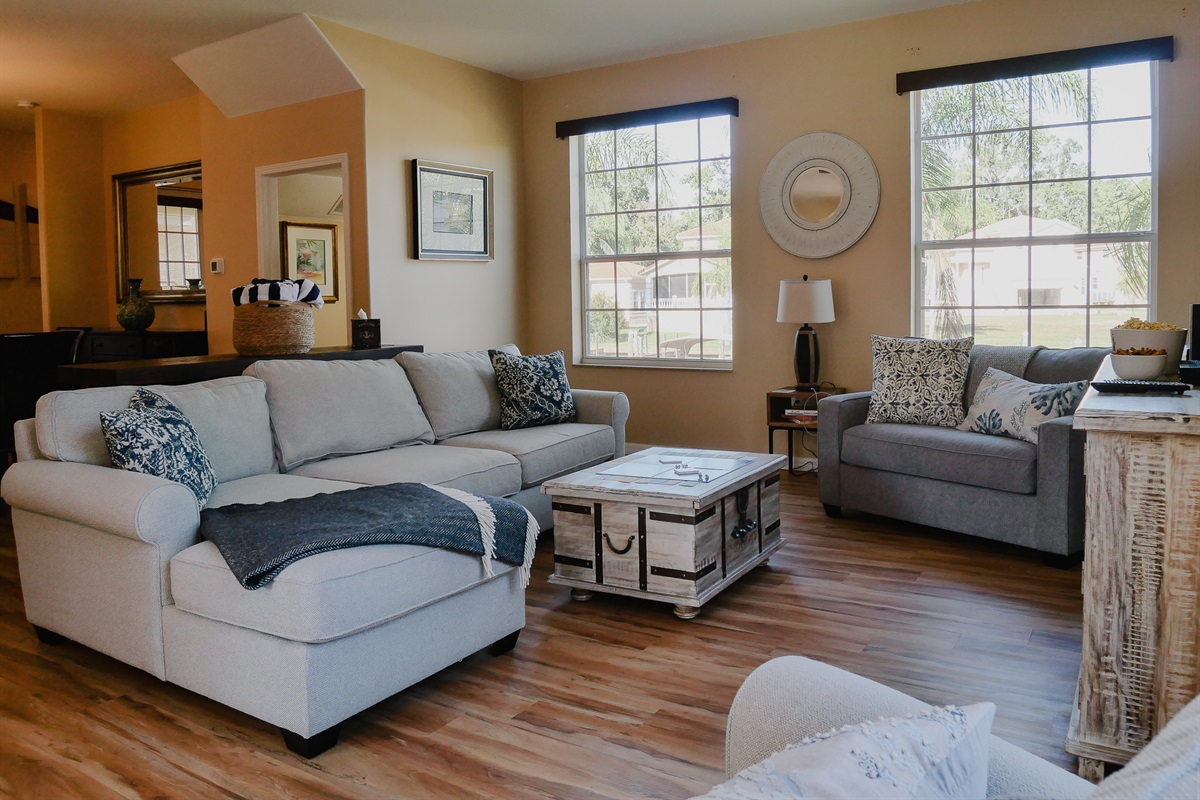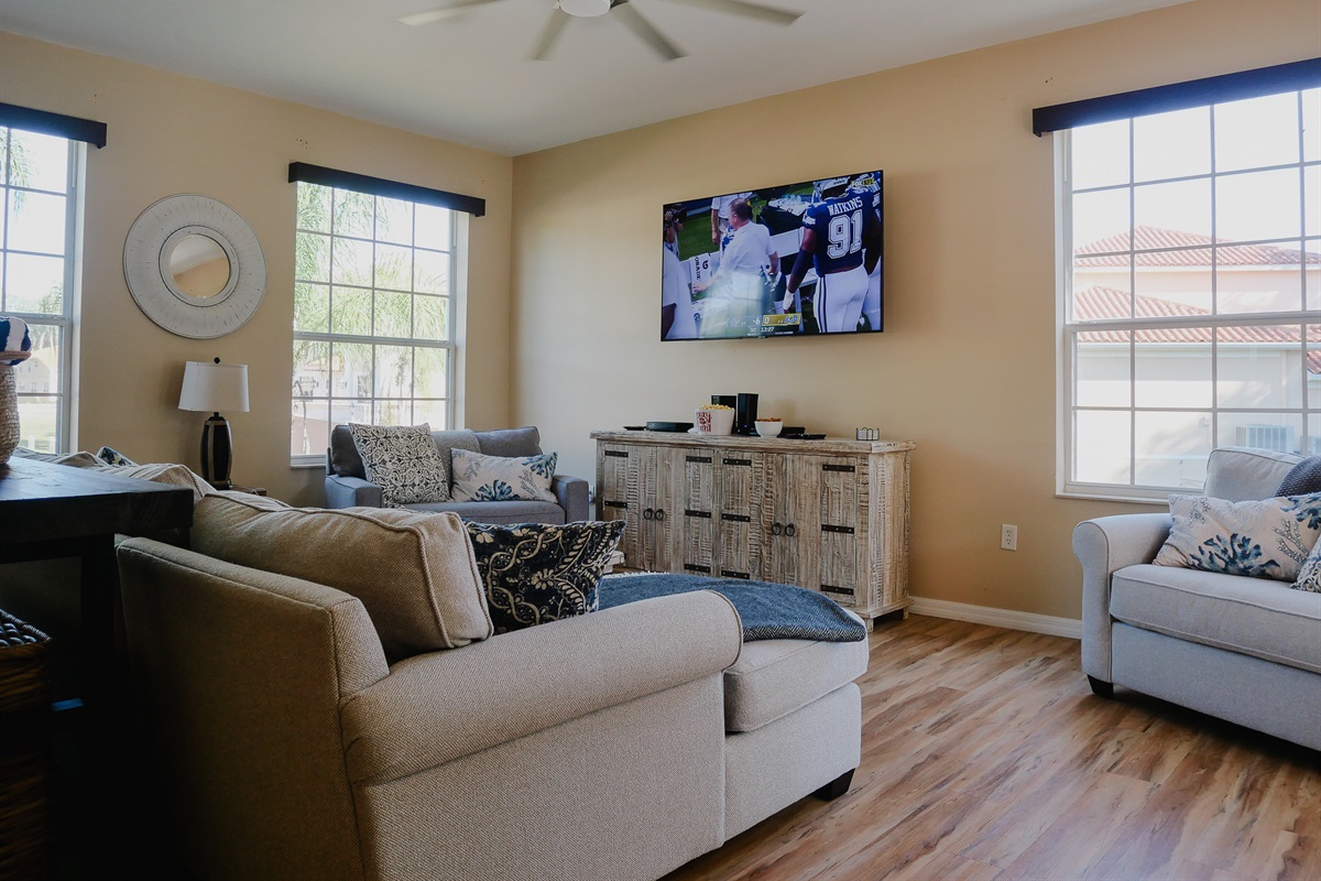 Well lit living room, boasts a 65 inch Samsung smart tv, sleeper sofa and three sleeper club chairs.Hair Dryer