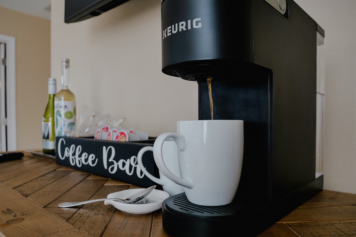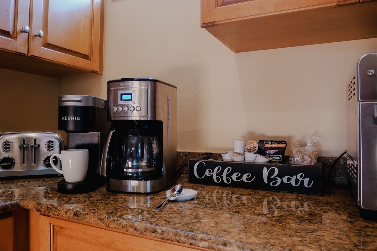 Cuisinart 14 cup coffee maker located in the kitchen. Kuerig located in master bedroom.Toaster