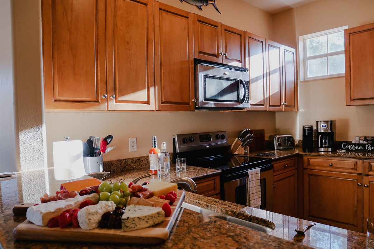 Fully stocked kitchen with pots, pans, blender, toaster, air fryer, 14 cup Cuisinart coffee maker, and more.Refrigerator